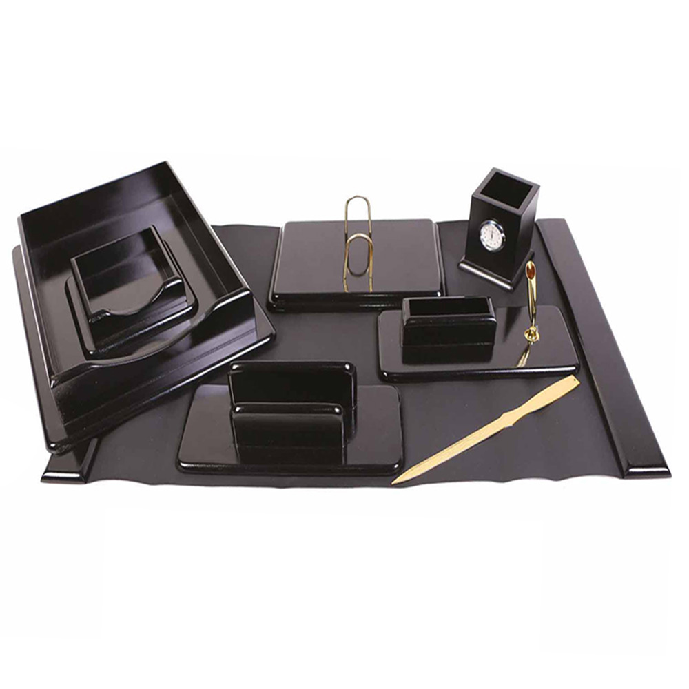 ست لوازم اداری رومیزی چرمی8 تیکه در 4 رنگ مشکی، قهوهای، طوسی و ونگه (قهوهای با تناژ قرمز) است. که شامل زیر دستی، کاذیه، جایادداشت، جاقلمی، پاکت باز کن، پایه خودکار، جا کارت ویزیت، جا پاکت نامه است.